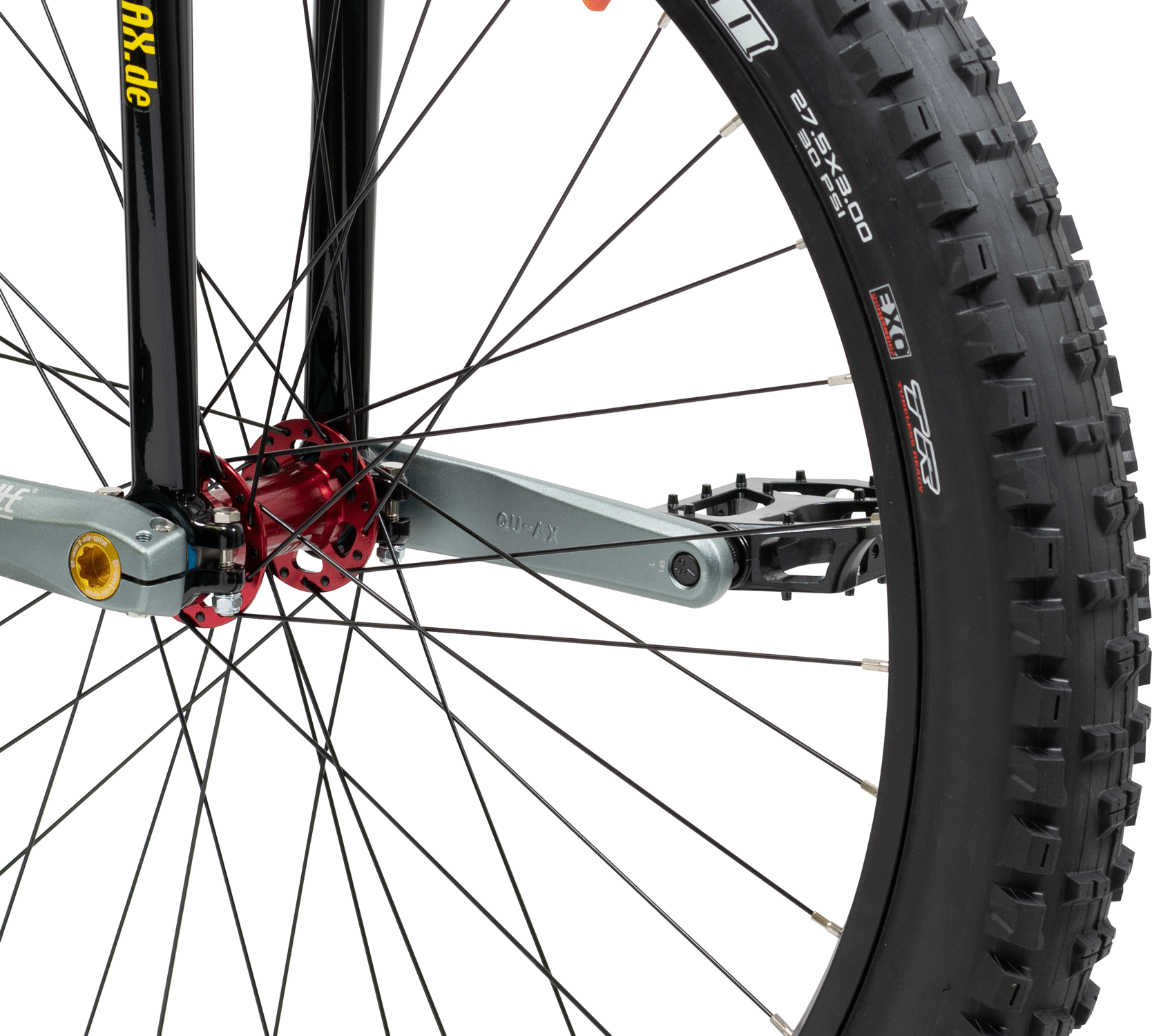 Die neue 27,5 Zoll Version des Qu-Ax Munis. Nachfolger vom 26 Zoll-Modell. Leichter als das 29er, besseres Überrollverhalten bei Hinderhissen als das 26er. Mehr Kontrolle, da mehr Auflagefläche als beim 26er.